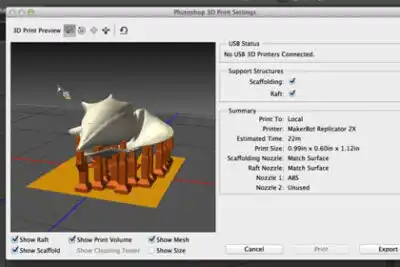 Photoshop «знает» многие популярные домашние 3D-принтеры, включая изделия MakerBot, с которой Adobe также заключила партнерство. В случае если принтера нет в библиотеке, его возможно добавить «вручную».